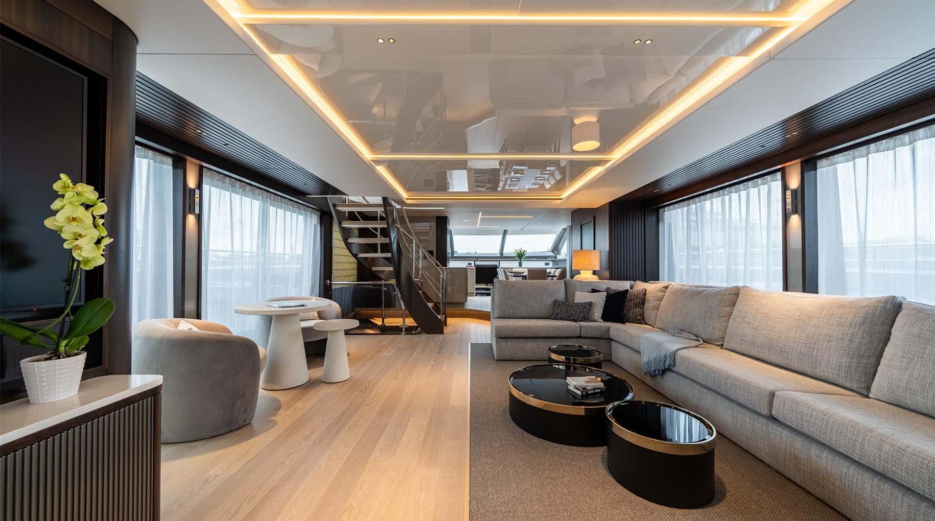 Named after her gross tonnage, she boasts over 2,000 square feet of interior space across three generous decks. The stunning saloon features a refined collection of loose furniture from handpicked suppliers, one step up separates the open saloon from the galley and dining space. This is truly a masterpiece of relaxed onboard living. The upper deck offers a spacious and luxurious onboard experience. With fully retractable sliding doors, the upper deck can fully close to create a third indoor living space or be left open to form an al-fresco balcony, promising the owner ultimate flexibility. Powered by Twin MAN V12 1900 engines, it reaches a top speed of 27 knots and has a range of 1,100 nautical miles at 12 knots, equipped with a CMC fin stabilisation system for stability.